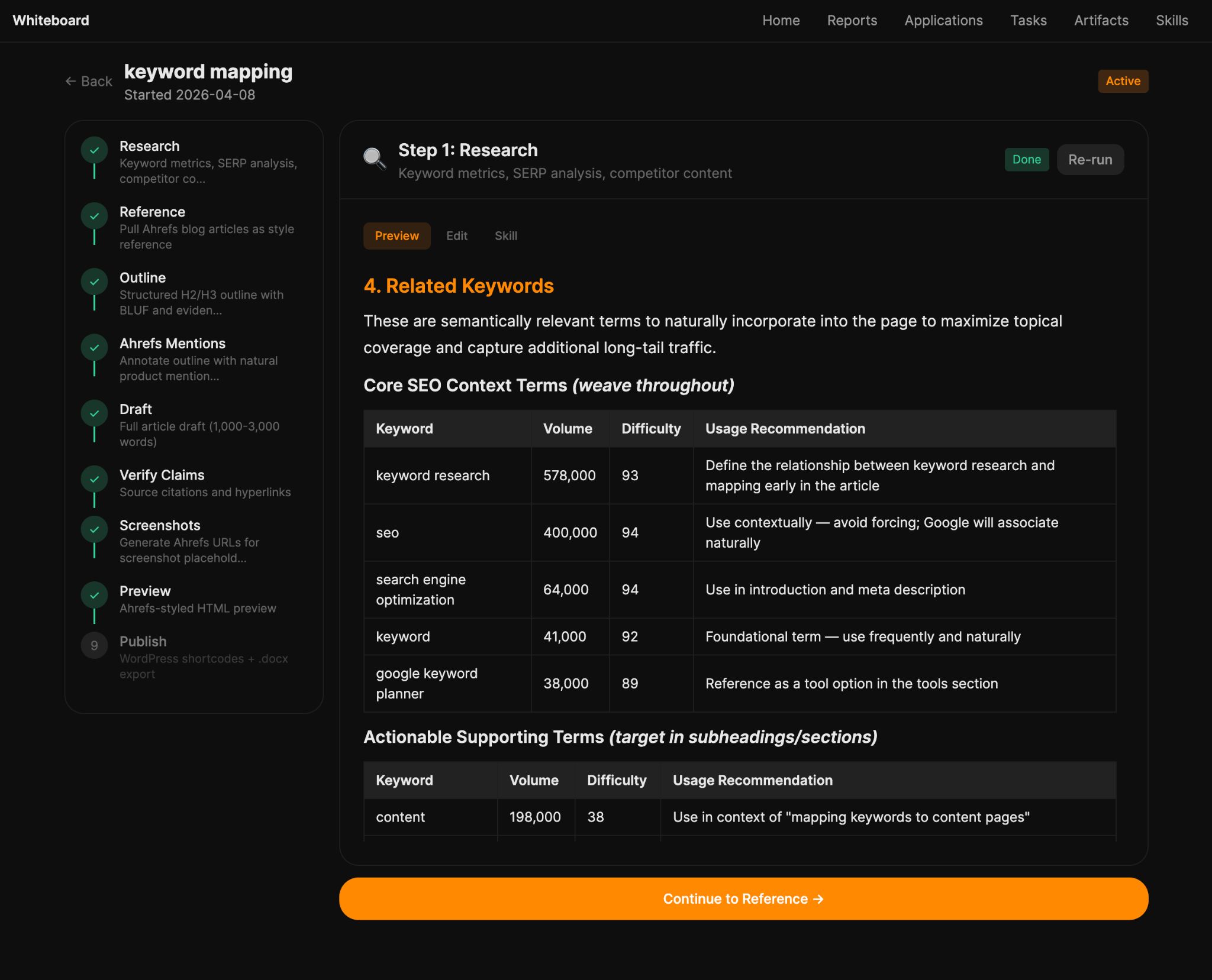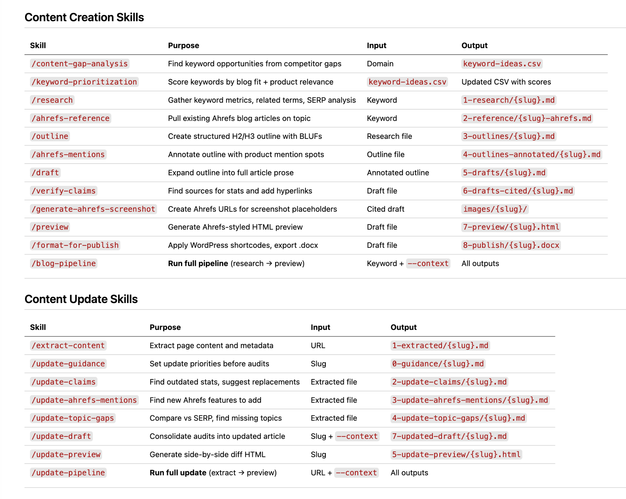 At the heart of this process are ~23 skill files that correspond to different parts of the Ahrefs editorial process, from conducting keyword research to topic gap analysis to structural outlining: