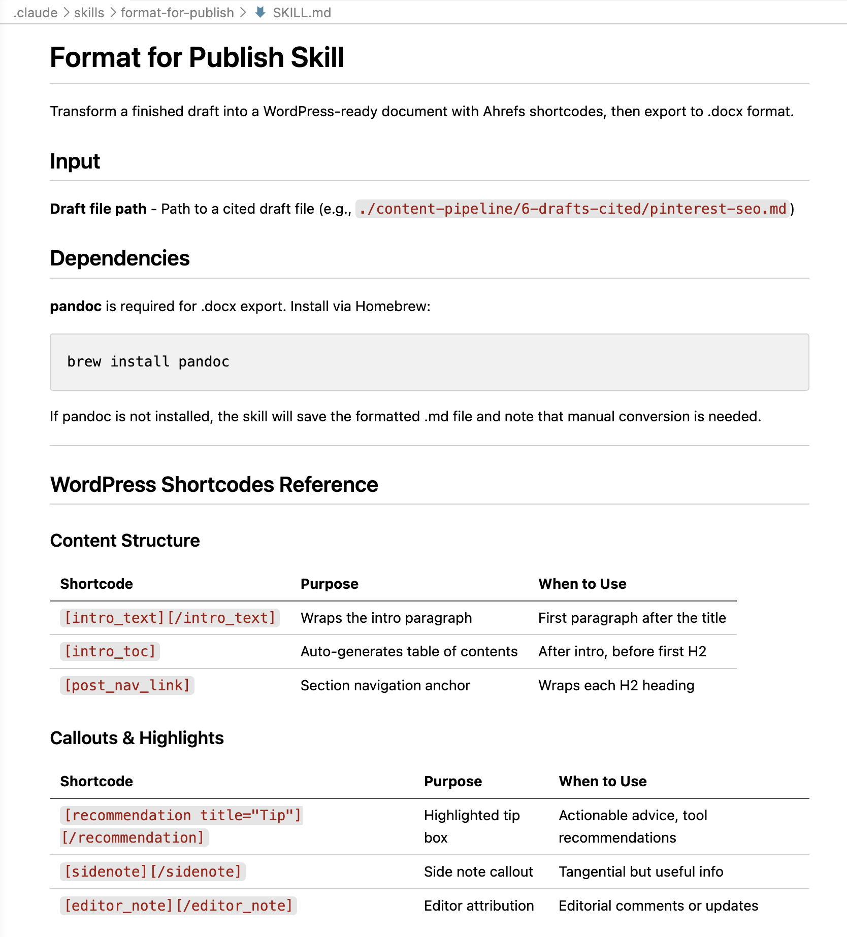 When I’m happy with the article draft and ready to upload and add images, I trigger a final skill that formats the article with all the correct tables and shortcodes we need.