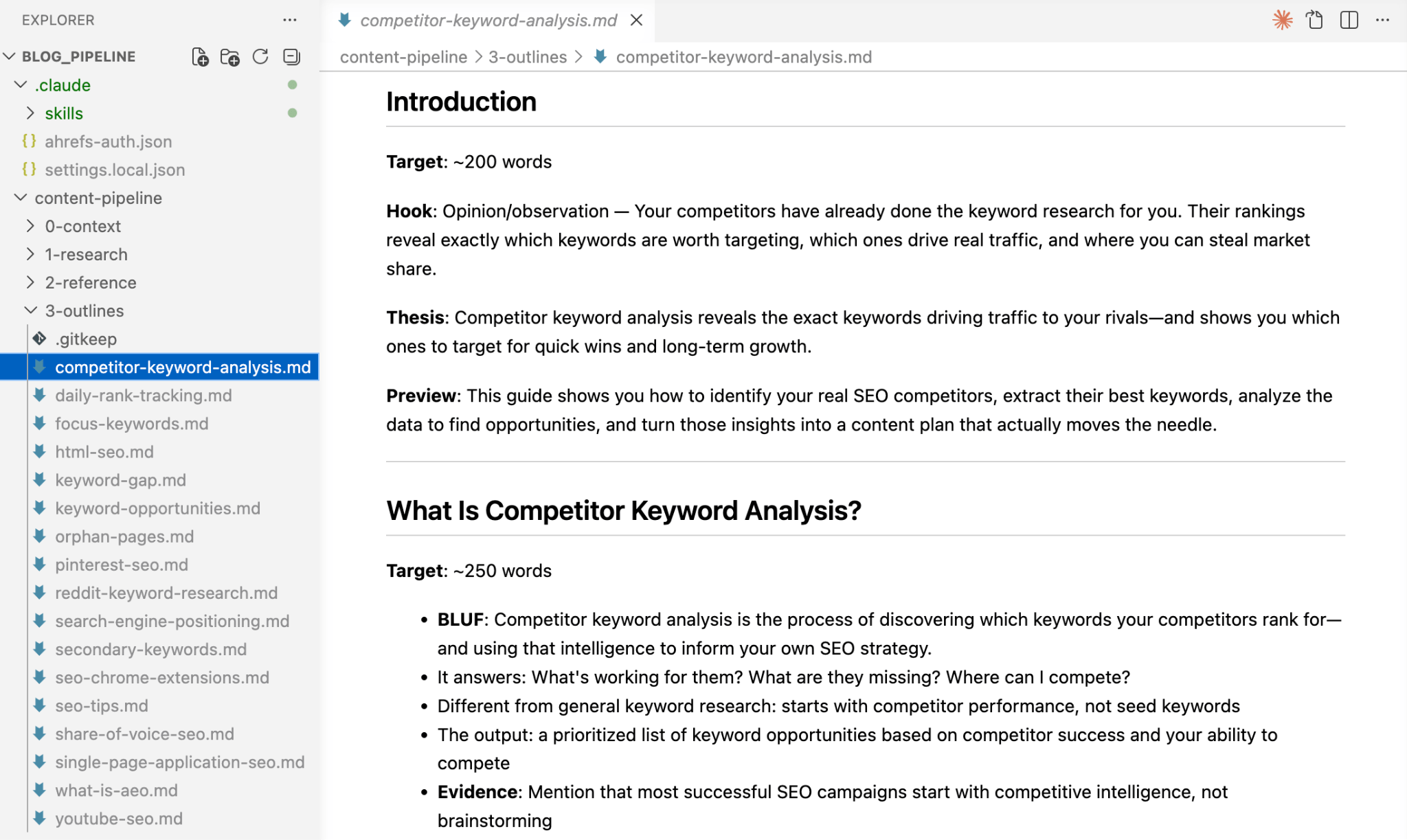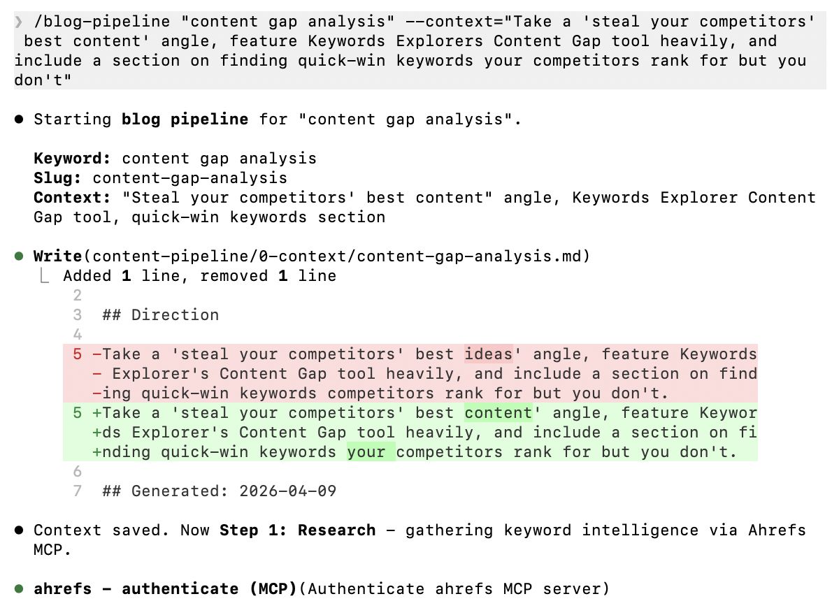 Theoretically, this process can be fully automated. Using the skill files I created, Claude can trigger a daily content gap analysis using the Ahrefs MCP, review and prioritize the best keywords to target, and kick off the entire blog-pipeline workflow, notifying me when new article drafts are ready for review.