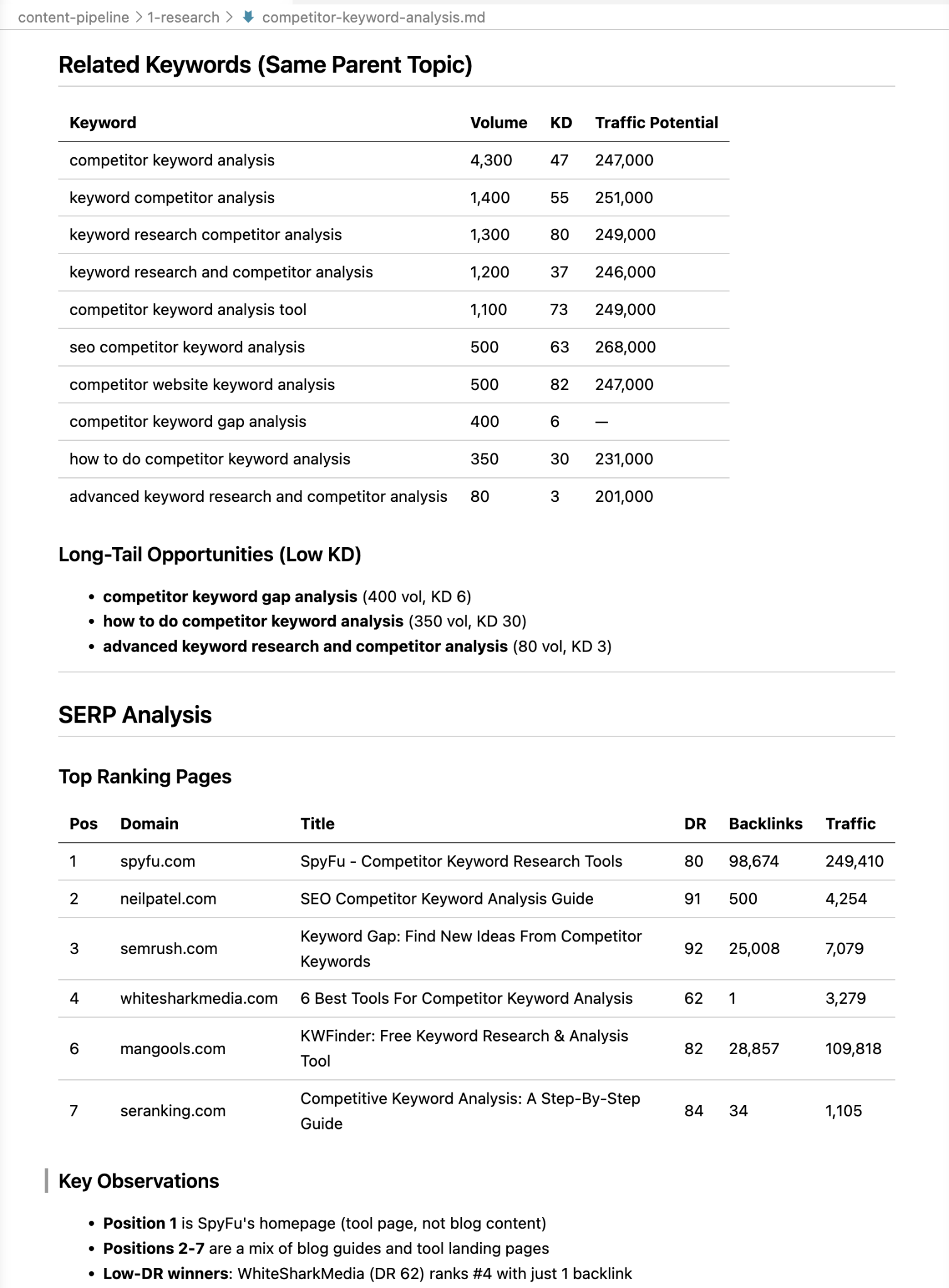 This process is only possible because Claude has access to the Ahrefs MCP.