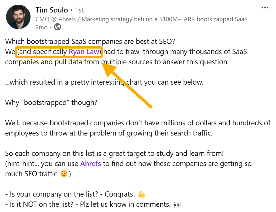 A post by “Ryan from Ahrefs” carries significance because of the hard work put into building Ahrefs the brand for the past decade. I stand on the shoulders of giants. Ahrefs is well-regarded; I inherent some small portion of those good vibes when I’m implicitly or explicitly associated with the brand.