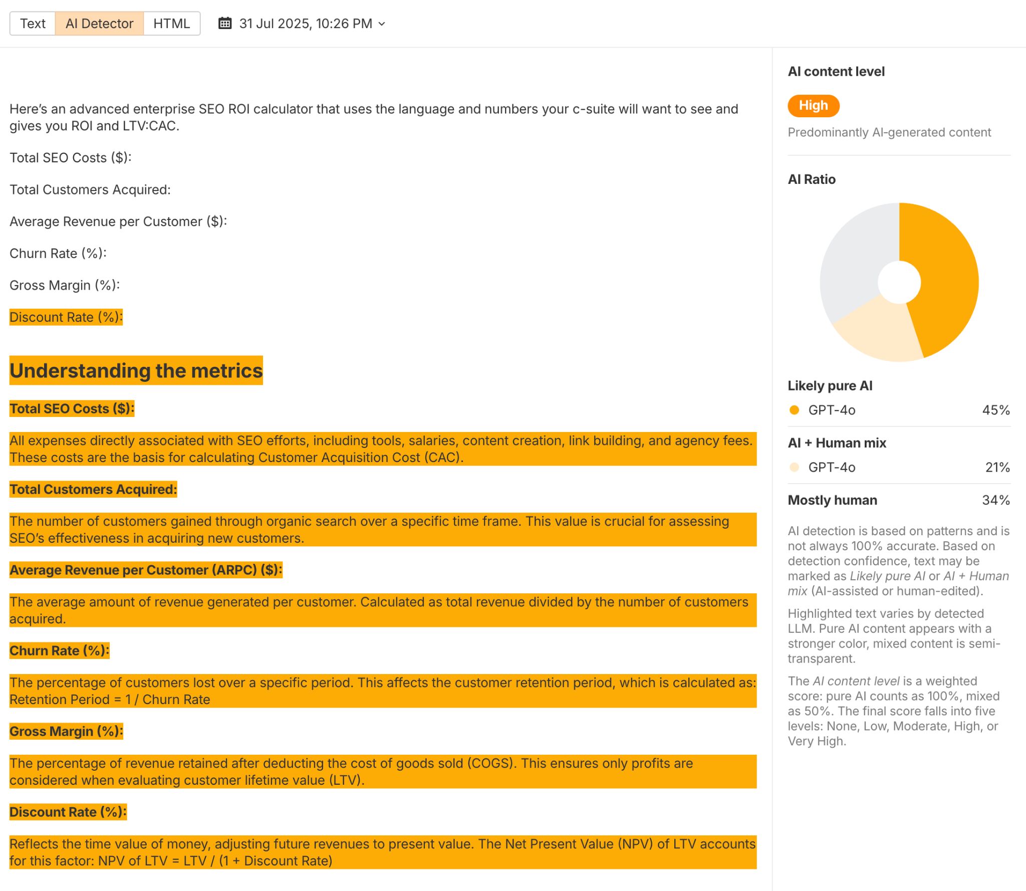 Good detectors don’t just give you a single yes-or-no verdict: they also break the text down and show you the likelihood that different passages are AI-generated, provide an overall article-level likelihood score, and in some cases even attempt to identify which models (such as GPT-4o) were likely used to create the content.