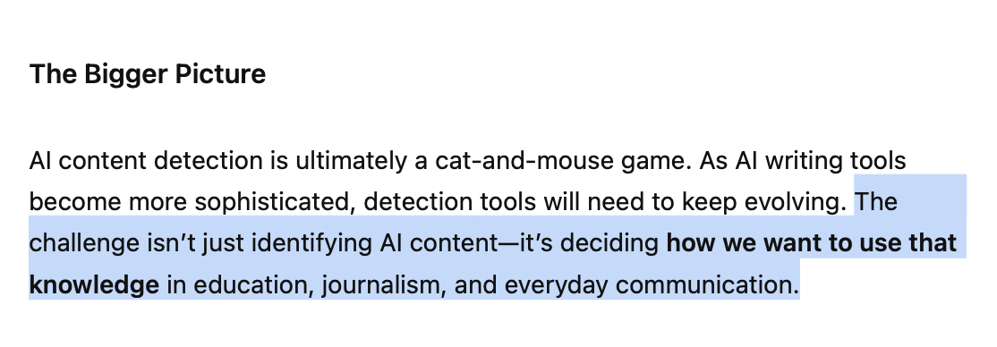 - Ambiguous cases (like human text edited by AI) can blur results. These hybrid workflows create mixed signals that can confuse even advanced systems.