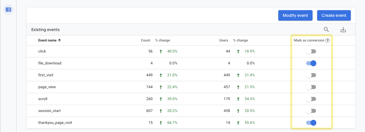 You simply slide the toggle named “mark as conversion” for the events you’d like to trigger conversions from this screen.
