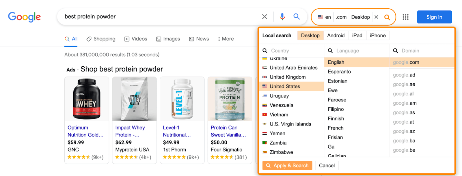 Look at the current top-ranking pages for your target keyword in Google and check for a dominant angle. You can see that the top three “best protein powder” articles are all listicles.