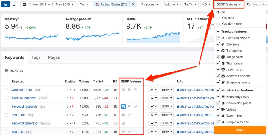 If you need to study which keywords have a specific SERP feature in the search results (and whether or not you rank in said feature), we have an awesome filter for that.