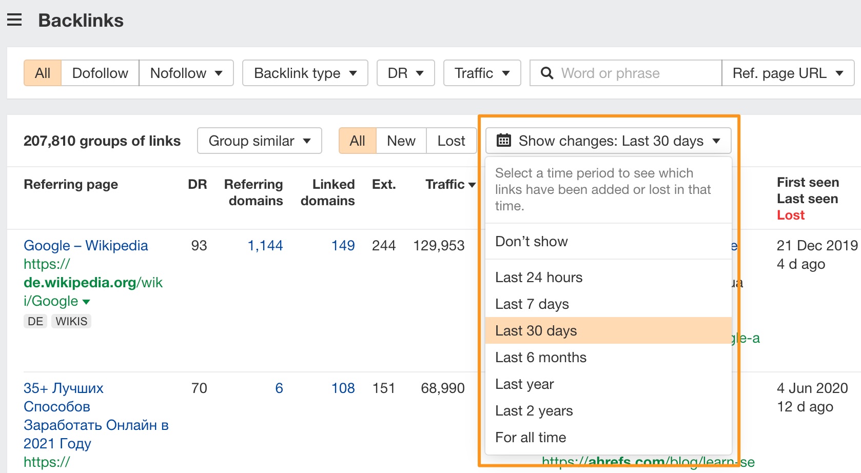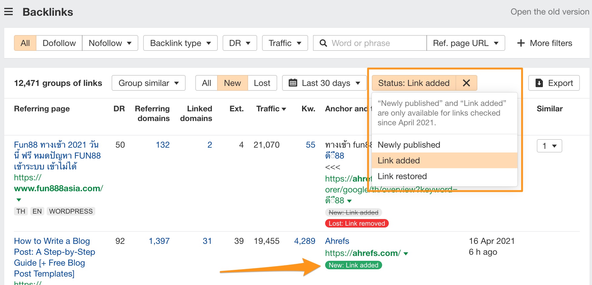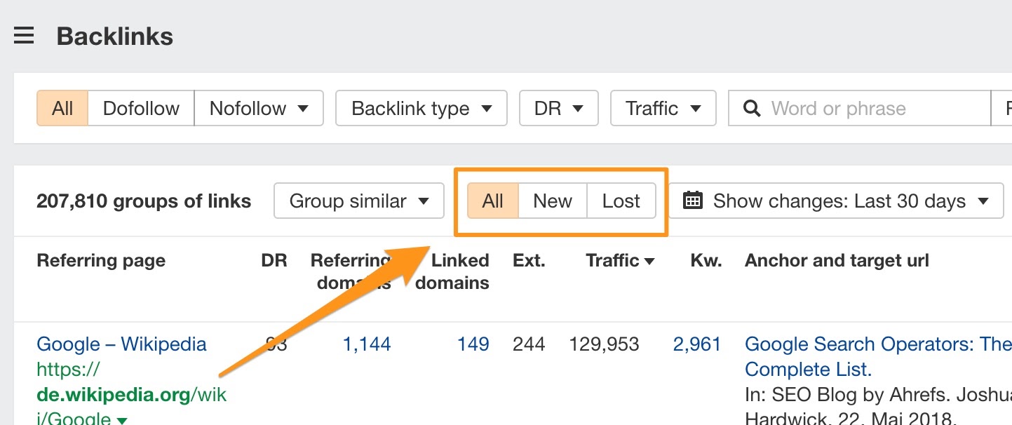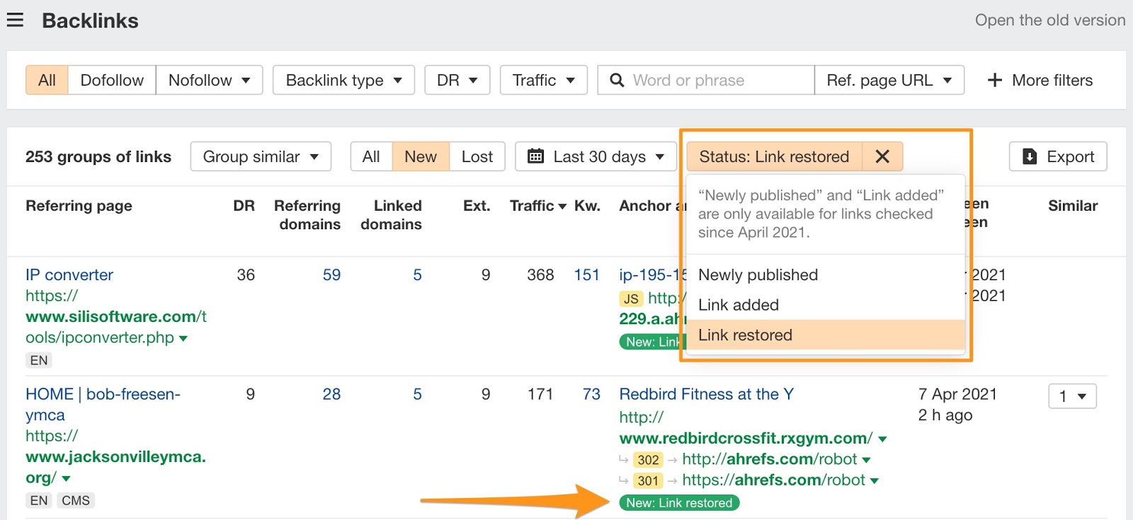 Previously, the “new” and “lost” backlinks reports existed as separate reports. They’ve now been integrated into the main one.