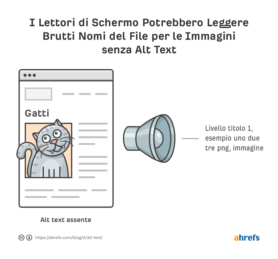 Le immagini senza l’alt text causano dei problemi ai lettori di schermo perché non c’è modo per loro di comunicare il contenuto dell’immagine all’utente. Di solito, tralasciano queste immagini, o peggio, leggono un lungo ed inutile nome del file dell’immagine.