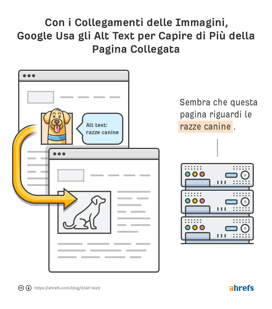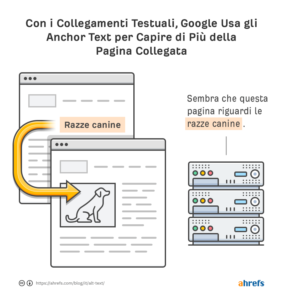 Se decidi di utilizzare una immagine come un collegamento, compilare il suo alt text aiuta Google a capire di più della pagina che è stata collegata. Immagina che tu stia scrivendo l’anchor text di un testo di collegamento.