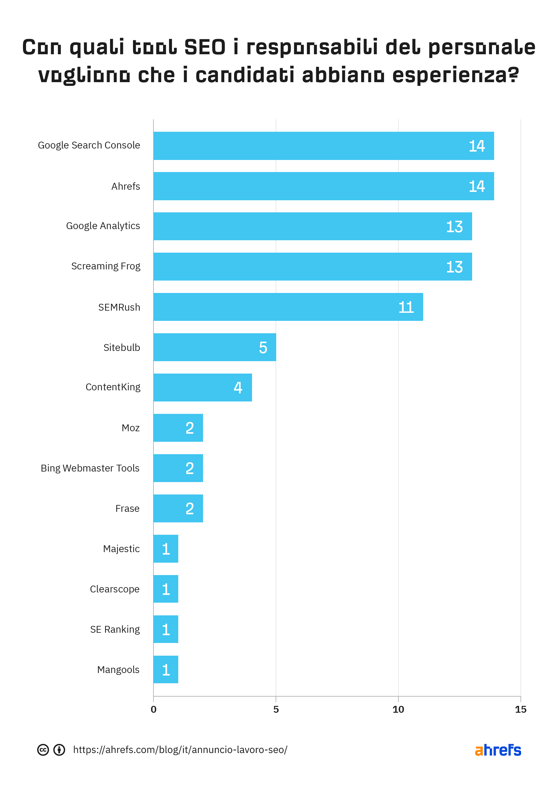 A parte gli anni di esperienza nel settore, la maggior parte dei risponditori al sondaggio preferisce anche che i loro SEO specialist abbiamo dimestichezza con alcuni tool SEO.