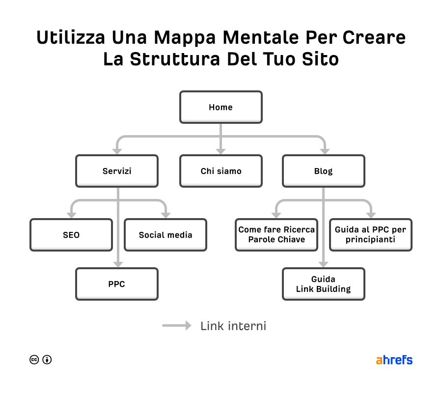 Ognuno dei rami della tua mappa mentale diventerà un link interno. Questi sono link da una pagina all’altra del tuo sito.
