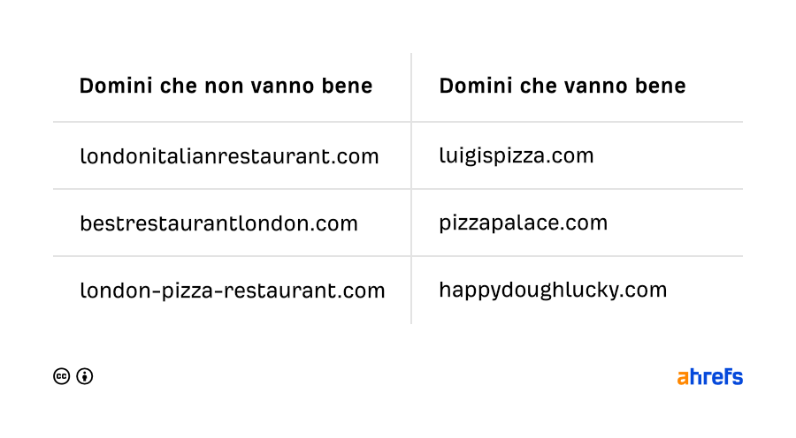 Per prima cosa, non preoccuparti di includere delle parole chiave. Il tuo dominio non deve essere qualcosa del tipo ristorantiitalianialondra.com per far sì che i motori di ricerca capiscano di cosa parli.