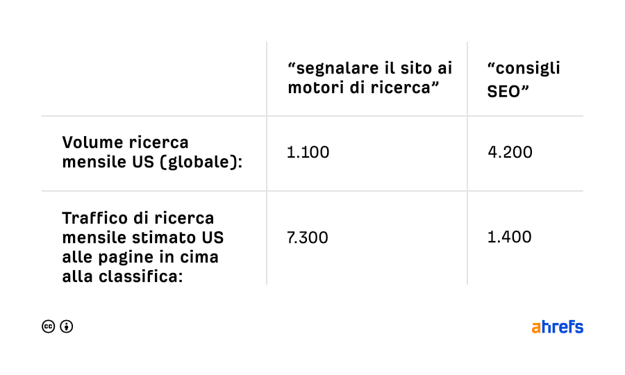 Ad esempio, “segnalare il sito ai motori di ricerca” vs. “consigli SEO”.
