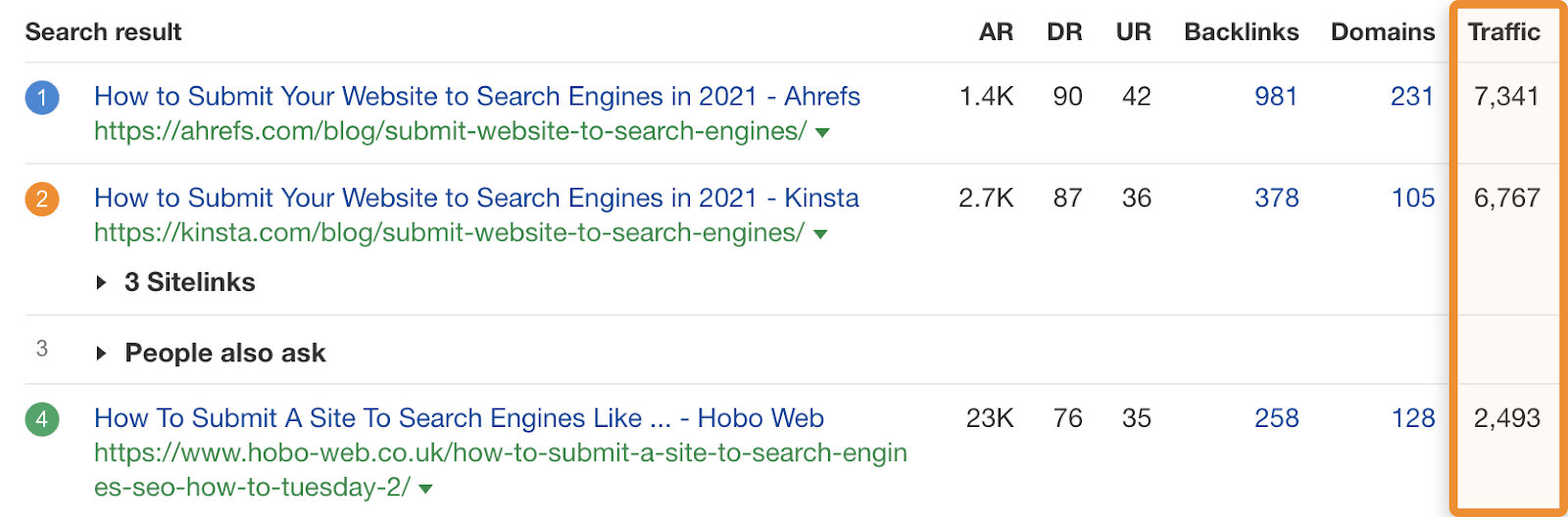 Ad esempio, guarda i primi 3 risultati per “segnalare il sito ai motori di ricerca”. Utilizzando il Keyword Explorer di Ahrefs, possiamo notare come la pagina meglio posizionata sembra essere quella che ottiene più traffico organico, seguita poi dalla seconda, dalla terza, ecc…