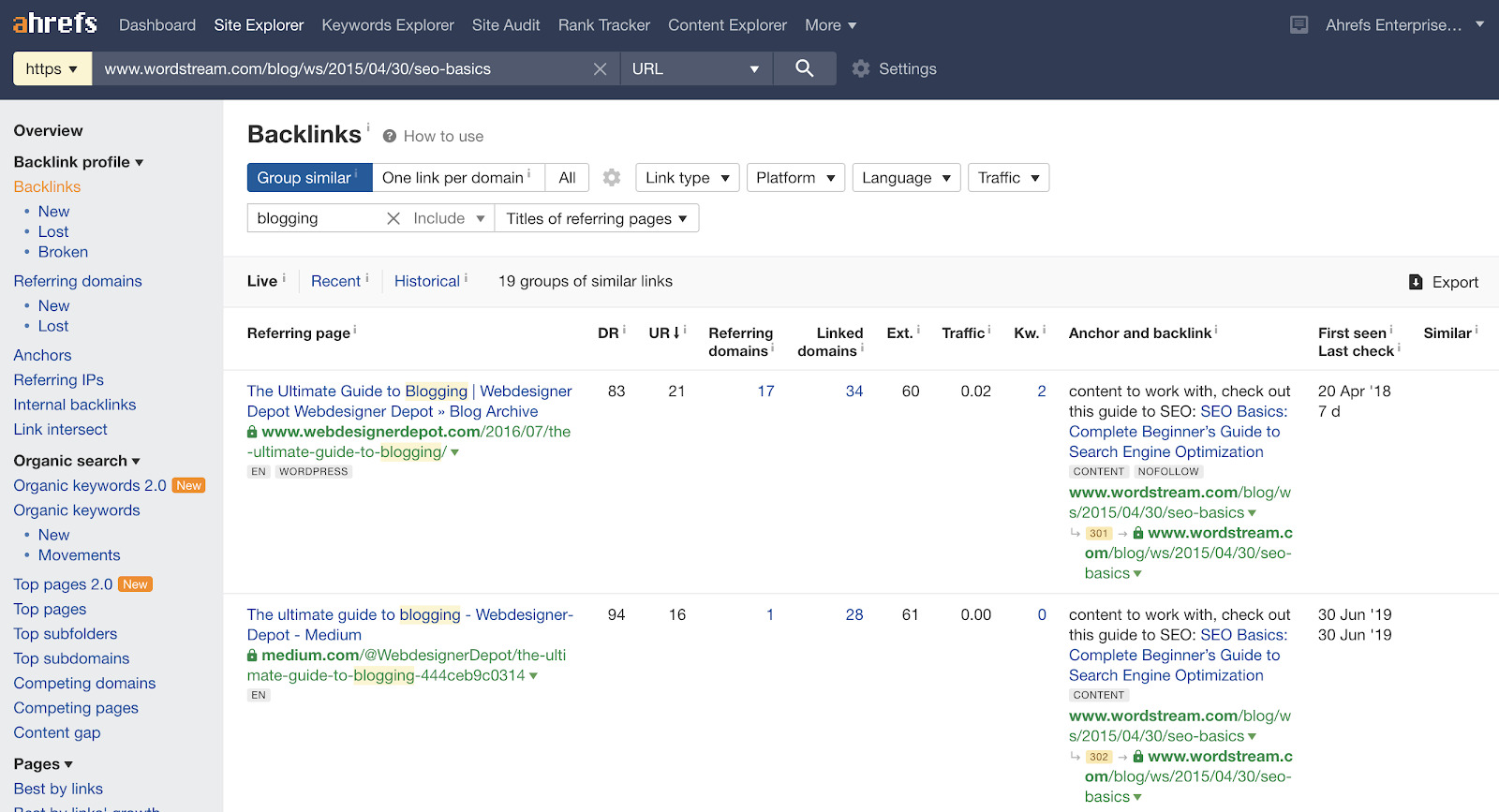 Vai poi alla ricerca di contenuti che potresti migliorare o comunque scrivere meglio. Inserisci poi la loro URL nel Site Explorer di Ahrefs, e identifica tutti i backlink all’interno del report Backlink. Contatta poi i proprietari dei siti.