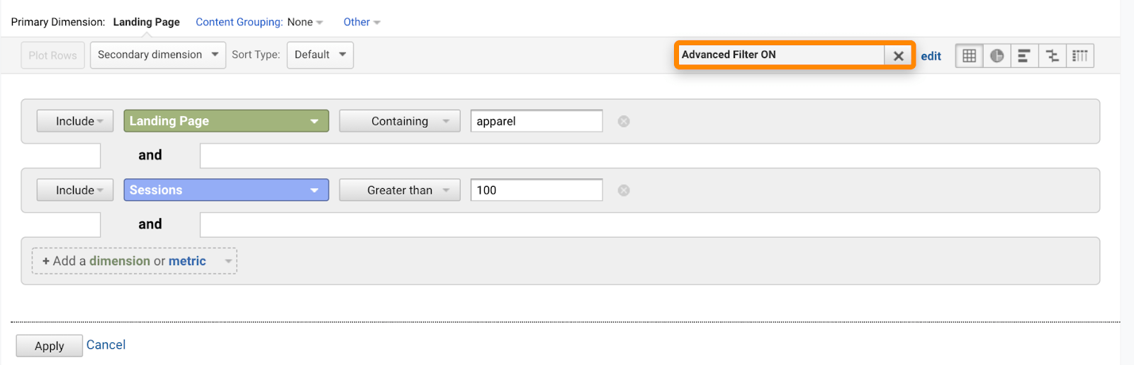 Per restringere ancora di più i risultati, analizzeremo le pagine di destinazione che hanno caratteristiche comuni escludendo quelle insignificanti. Possiamo ad esempio filtrare le pagine prodotto che contengono la parola “appareal” (in italiano: abbigliamento) all’interno della url ed escludendo invece le pagine che hanno avuto meno di un centinaio di sessioni (e che hanno quindi poca rilevanza statistica):
