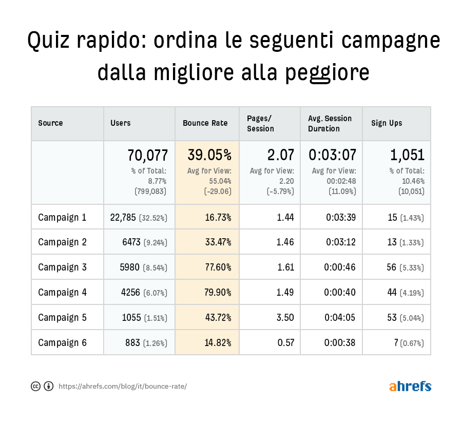 Il punto è che le campagne #6 e #1 hanno i migliori bounce rate, ma sono terribili a convertire gli utenti.