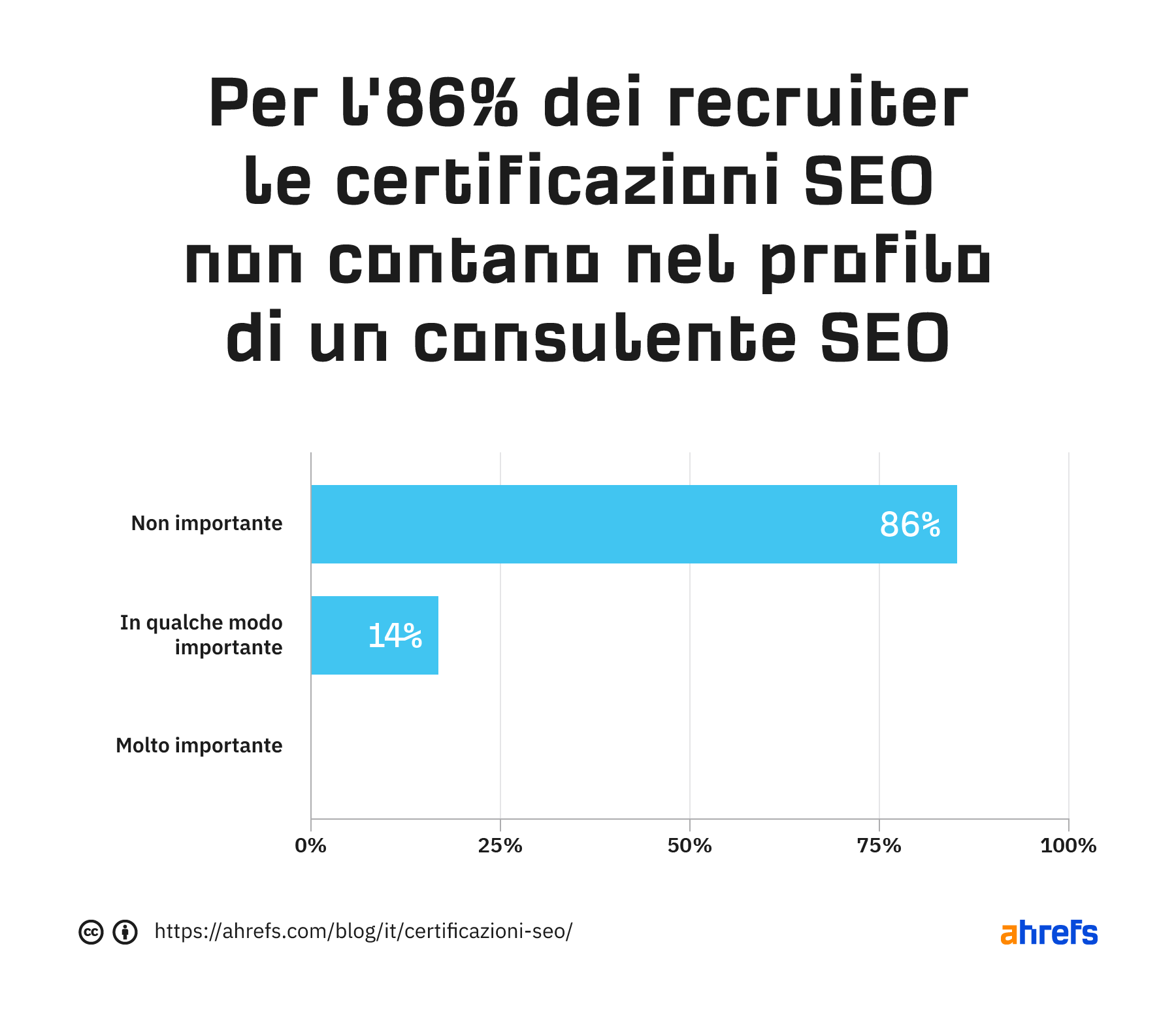 Abbiamo chiesto a 15 responsabili del personale SEO quali fossero le skill ed i requisiti che ritengono importanti quando assumono un SEO specialist. L’86% ha detto che le certificazioni SEO non sono importanti, ed il resto ha detto che non lo sono in maniera particolare.