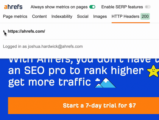 I codici di stato indicano il modo in cui il tuo client e un server comunicano tra loro. Puoi visualizzare gratuitamente i codici di stato HTTP di qualsiasi pagina utilizzando la SEO Toolbar di Ahrefs cliccando sul numero a tre cifre.