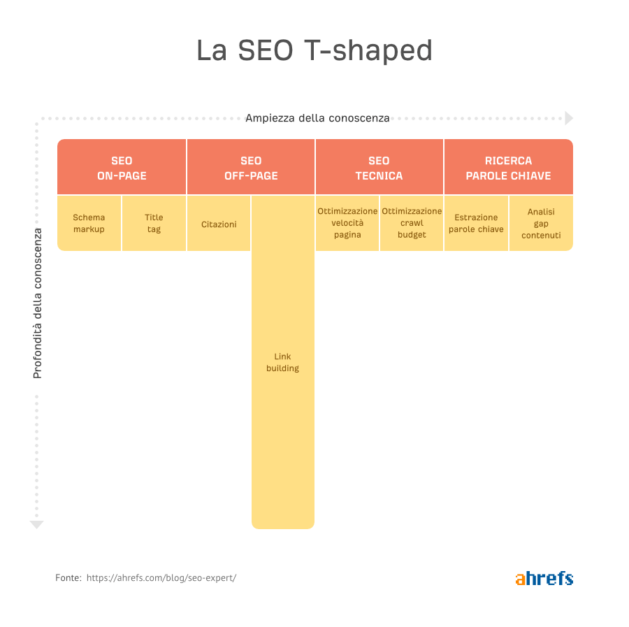 Quindi una volta che sai quello che ti piace fare, è arrivata l’ora di espandere le tue conoscenze in quella specifica area. Fallo e diventerai presto quello che Rand Fishkin chiama un marketer T‑shaped, o a forma di T. Puoi poi cominciare inquadrare meglio i tuoi servizi.
