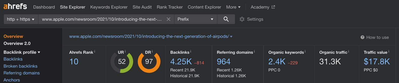 All’interno del Site Explorer di Ahrefs, inserisci l’URL della pagina in cui è ospitato il tuo comunicato stampa. Qui potrai vedere il numero di backlink ricevuti.
