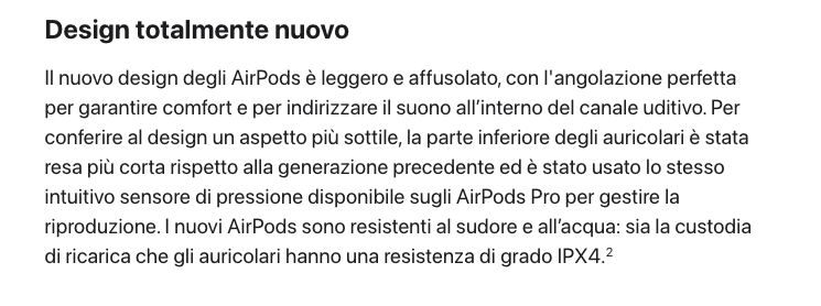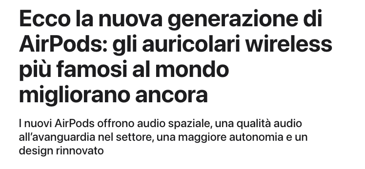 Si apre annunciando il lancio degli AirPod aggiornati. I paragrafi successivi contengono informazioni sul design del prodotto, sulle caratteristiche audio e sulla durata della batteria, ciascuno sotto il proprio sottotitolo in grassetto.