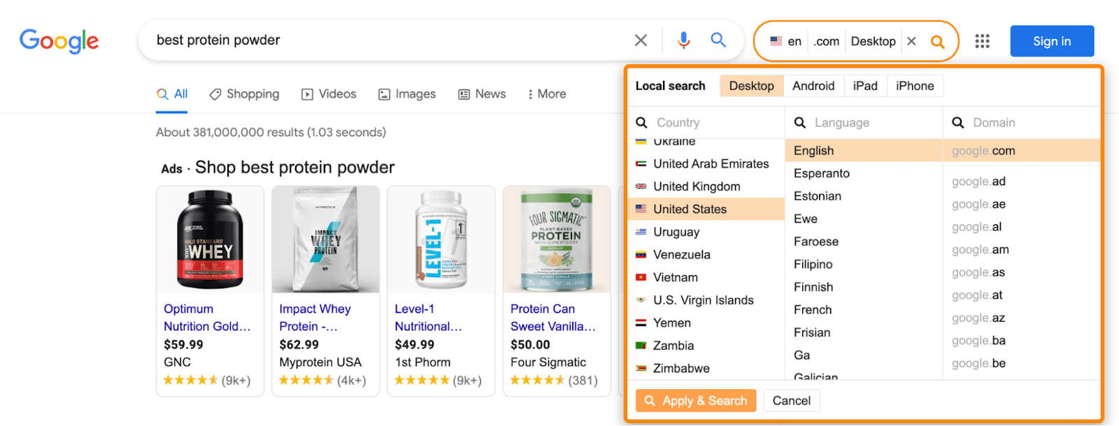 Tieni a mente che i risultati di Google sono personalizzati in base a fattori come la tua posizione e la cronologia di ricerca. Per ovviare a questo, utilizza la Toolbar SEO di Ahrefs attraverso una finestra in incognito per simulare una ricerca dal Paese e nella lingua che ti interessano.