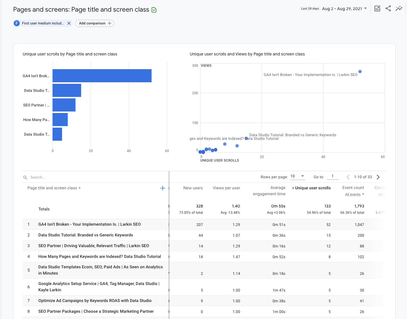 Le restanti colonne nella tabella mostrano le “metriche”. Una metrica è uno specifico elemento di una categoria. Ad esempio, la categoria “Titolo della pagina” può essere associata ad una metrica come nuovi utenti, scorrimenti unici, conteggio eventi e altre metriche di coinvolgimento.
