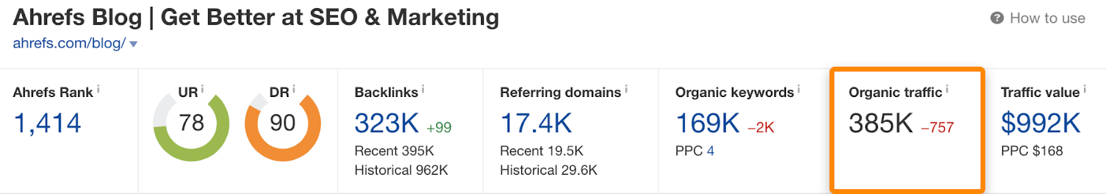 Nel nostro caso il nostro blog si posiziona per 170.000 parole chiave, portandoci un traffico stimato di 358.000 visite al mese. Se dovessimo provare ad ottenere lo stesso risultato attraverso gli annunci a pagamento, dovremmo spendere una stima di $992.000 al mese — una cifra che non si avvicina minimamente a quello che spendiamo per creare i nostri contenuti.