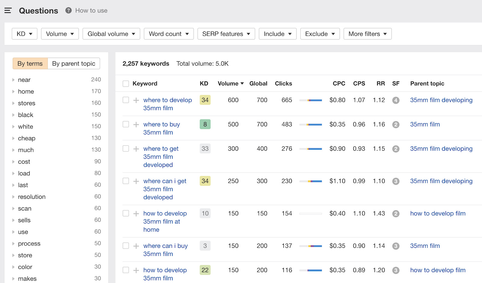 Inserisci questa parola chiave all’interno del Keyword Explorer di Ahrefs, e poi dai uno sguardo al report chiamato Questions, che contiene idee correlate sotto forma di domande. Scrivi e salva ogni domanda alla quale potresti rispondere creando un articolo sul blog.