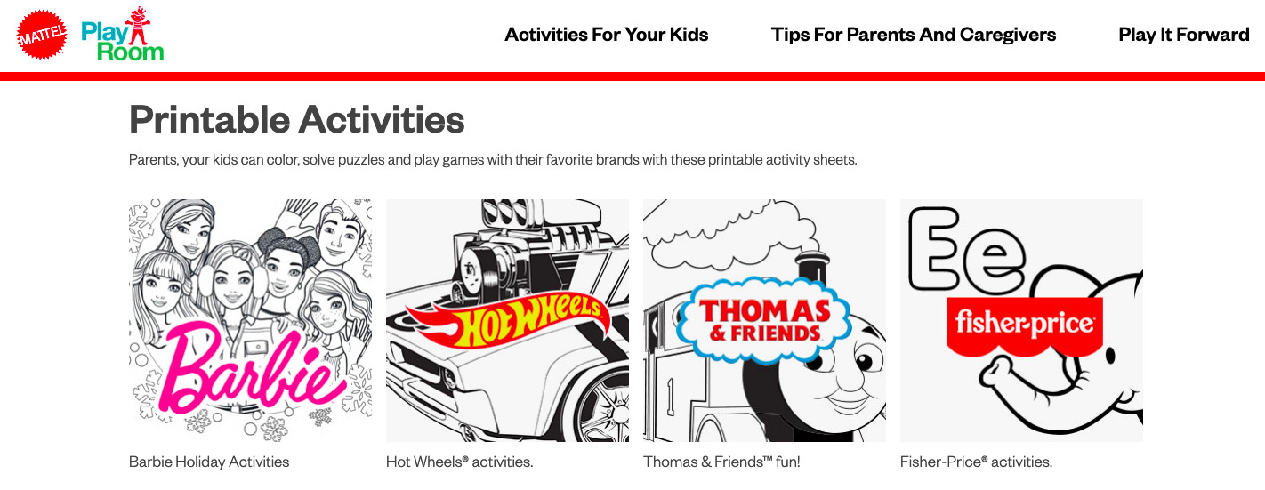 Cosa fanno → Durante il mese di Marzo 2020, il produttore di giocattoli Mattel (conosciuto per Barbie, Hot Wheels ed il brand Fisher-Price) ha risposto al COVID-19 creando una stanza dei giochi virtuale con giochi gratuiti e un PDF di attività scaricabile per bimbi e famiglie.