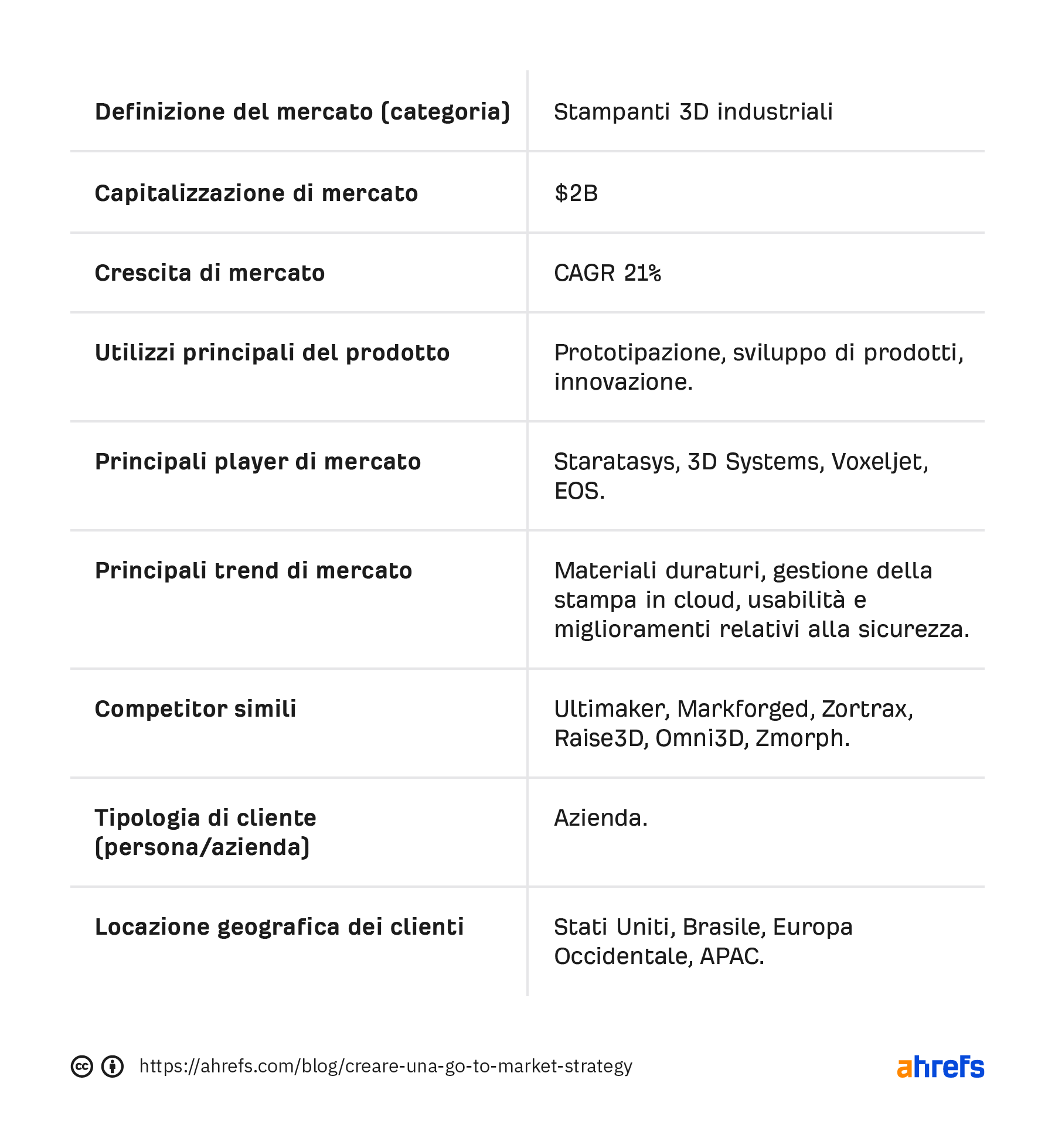 Per identificare i punti chiave di una ricerca di mercato, prendi ad esempio la tabella qui sotto. L’abbiamo riempita con dei dati fittizi per il settore della stampa 3D. Puoi riempirla con i dati provenienti dalla tua ricerca, in questo modo sarai pronto per il passo successivo: il processo della GTM.