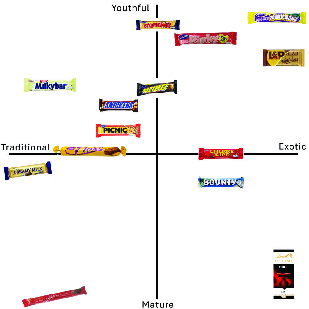 Nestlé ha commissionato la mappa percettiva qui sopra per aiutarsi a commercializzare una nuova barretta di cioccolato sul mercato (case study). La mappa mostra il modo in cui i consumatori percepiscono la concorrenza fra i vari cioccolatini in Nuova Zelanda. Ad esempio, in questo caso, la barretta al cioccolato fondente di Lindt al peperoncino è stata etichettata come una scelta esotica e da adulti mentre, la Milkybar, come una scelta più tradizionale per un’audience più giovane.