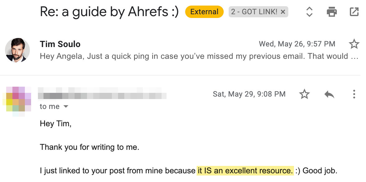Avrei potuto benissimo evitare di scrivere una “proposta allettante” per persuadere queste persone e convincerle che il mio articolo fosse fantastico e degno di un link. Avevano infatti già visto i nostri contenuti su Ahrefs e ne erano entusiasti. Quando ho proposto loro l’articolo, si sono fidati, e hanno dato per scontato che fosse di buona qualità.