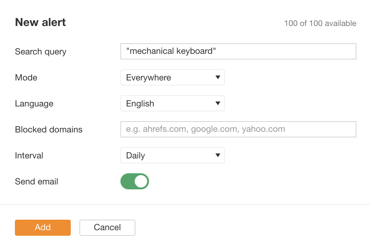 Ma questo non è tutto. Puoi addirittura impostare degli alert email per farti segnalare da Ahrefs quando un nuovo contenuto, che menziona la tua parola chiave, viene scansionato.
