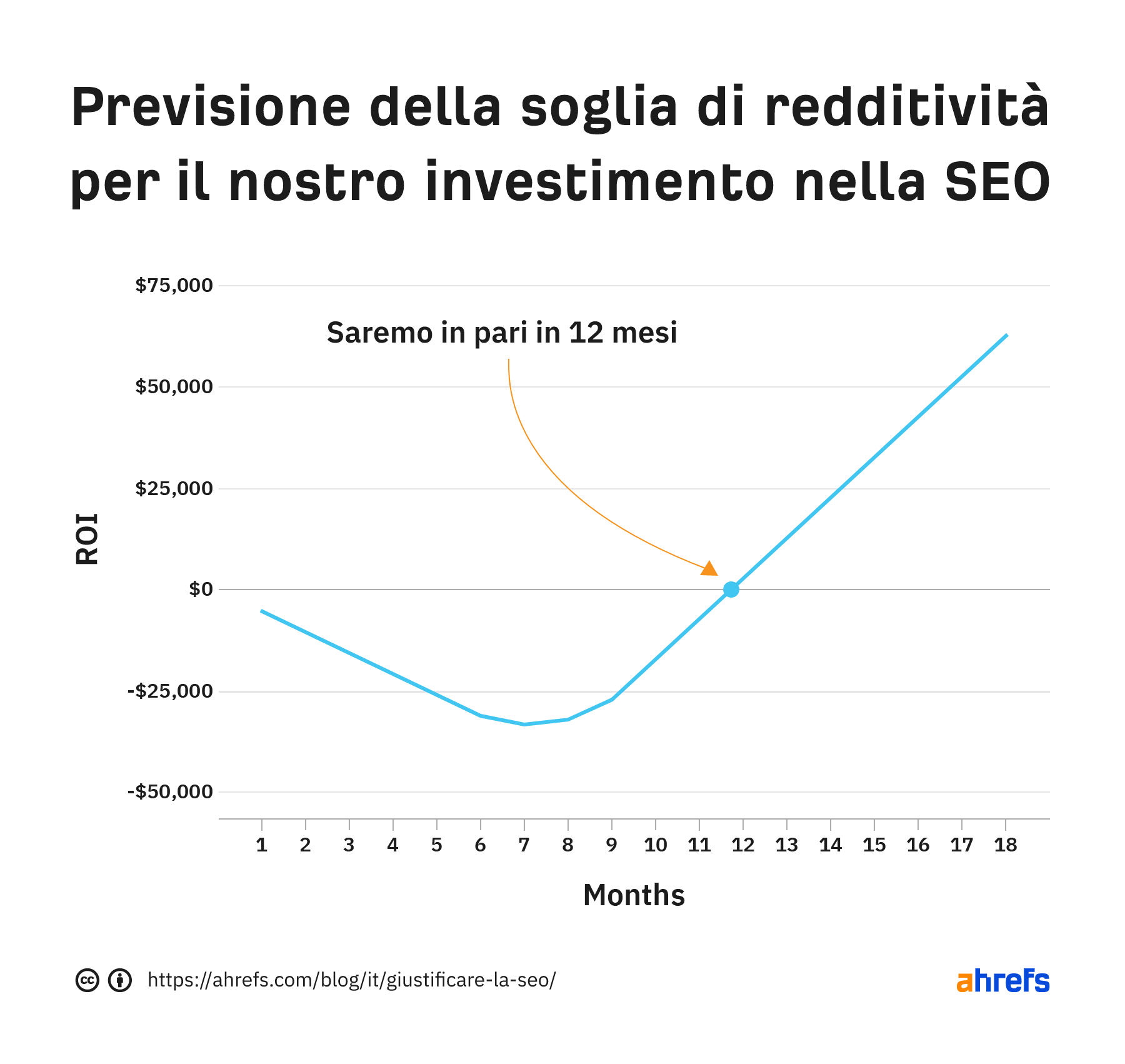 Per questo motivo, ha più senso creare un grafico che illustri il cosiddetto punto di “break even”. Questo mostra quanto tempo ci vorrà prima di recuperare i denari investiti nelle attività SEO.