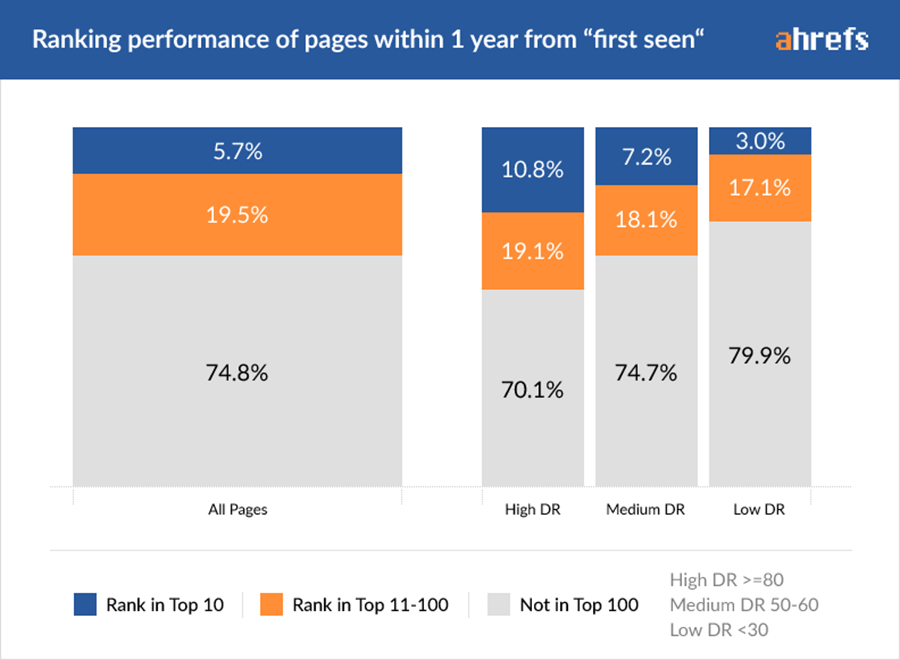 Infatti, secondo il nostro studio compiuto su due milioni di parole chiave, solo il 5.7% delle pagine si posiziona in top 10 entro un anno: