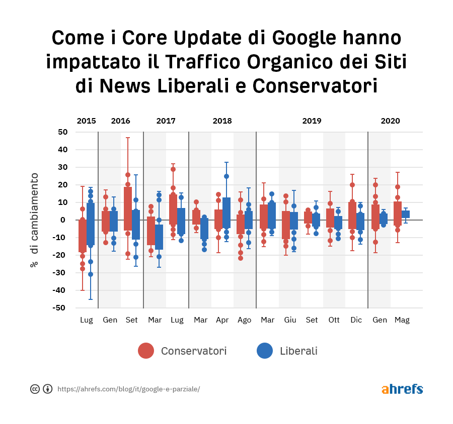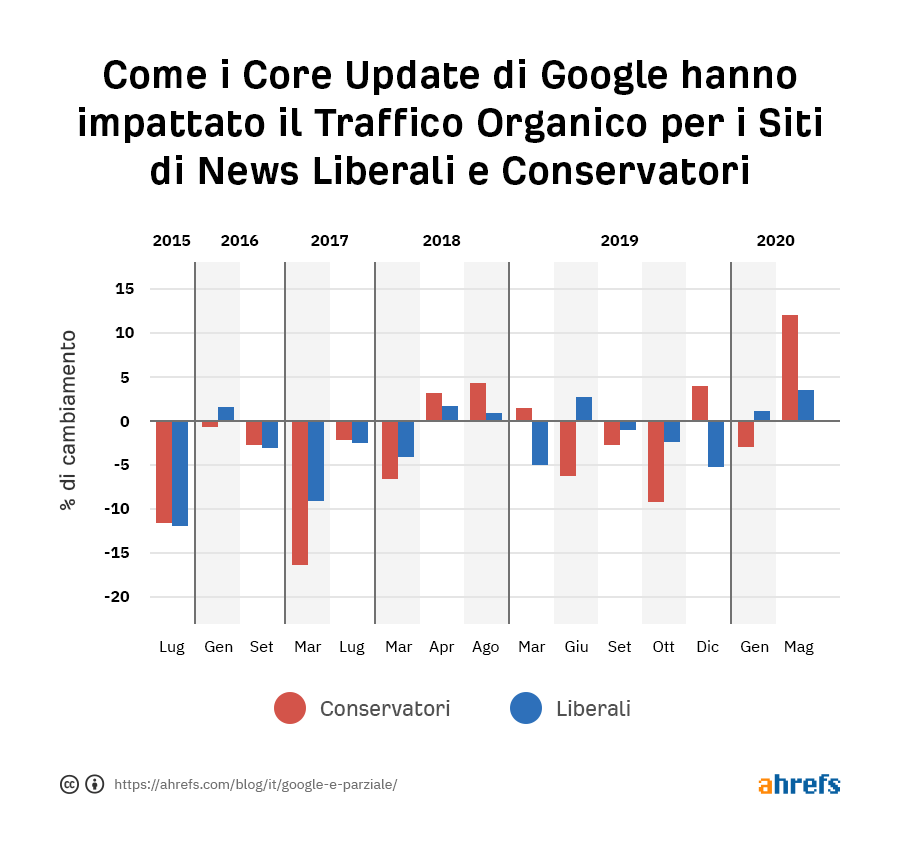 Google apporta centinaia di modifiche e miglioramenti ai propri algoritmi ogni anno. La maggior parte di questi non viene notata perchè piuttosto piccola, ma ogni tanto ce ne sono alcuni particolarmente grandi chiamati ‘core’ update che impattano una grossa percentuale dei risultati di ricerca.Dato che Google dichiara il rilascio di questi update più corposi, abbiamo pensato di poter analizzare il traffico organico dei giornali Conservatori e Liberali prima e dopo questi updates, cercando di evidenziare eventuali parzialità.