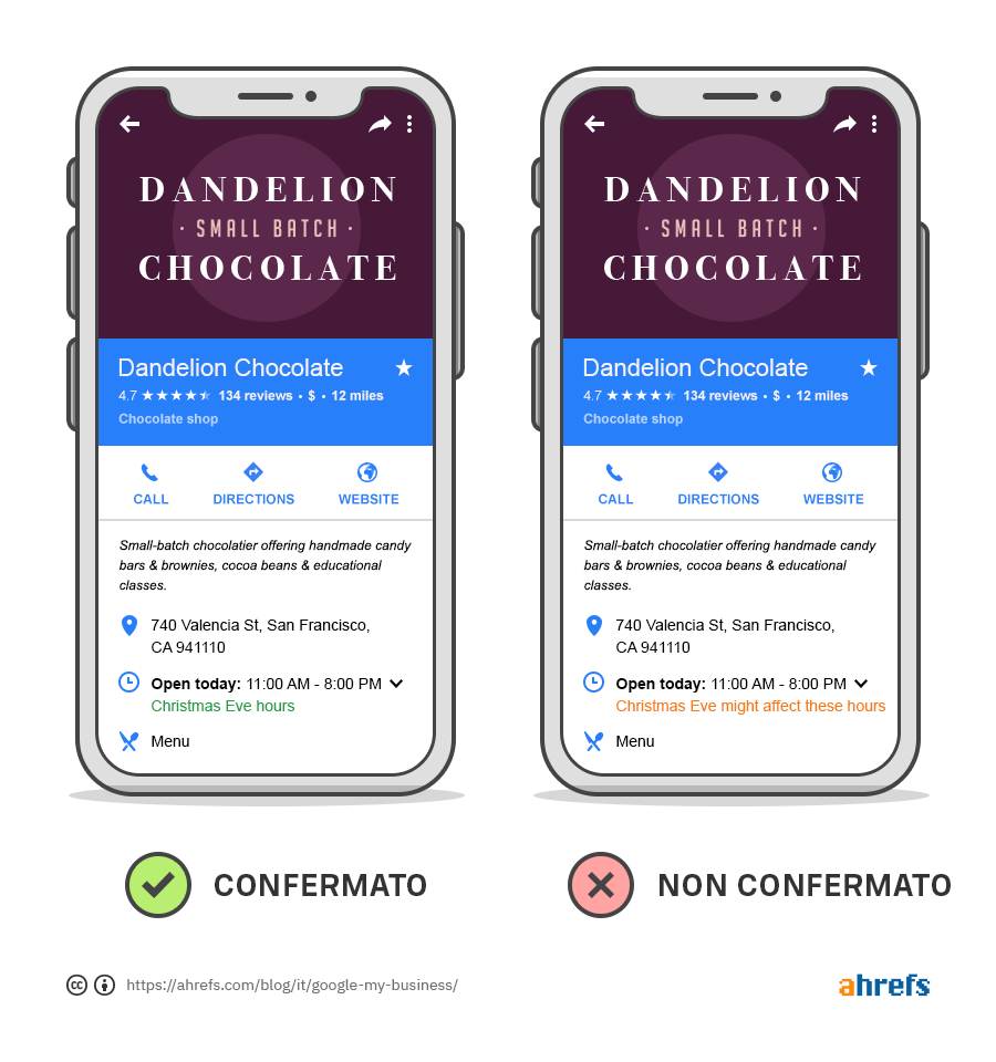 Nota che anche se i tuoi orari di ferie sono gli stessi dei tuoi orari normali, li dovresti confermare. Se non lo fai, i clienti potenziali vedranno un avviso nella tua scheda “[Le festività] potrebbero modificare questi orari”.