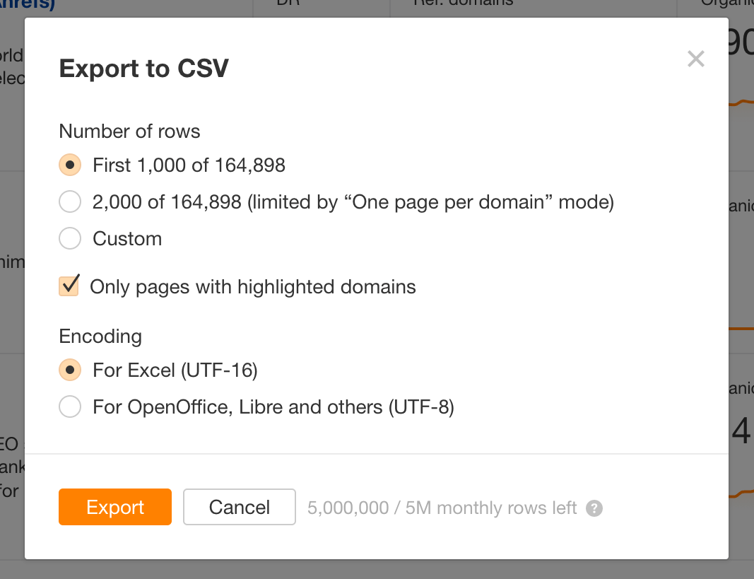 Infine, esporta il report, seleziona l’opzione chiamata “Only highlighted unlinked domains”, e contatta tutti i siti rilevanti chiedendo di rendere la menzione un link cliccabile.