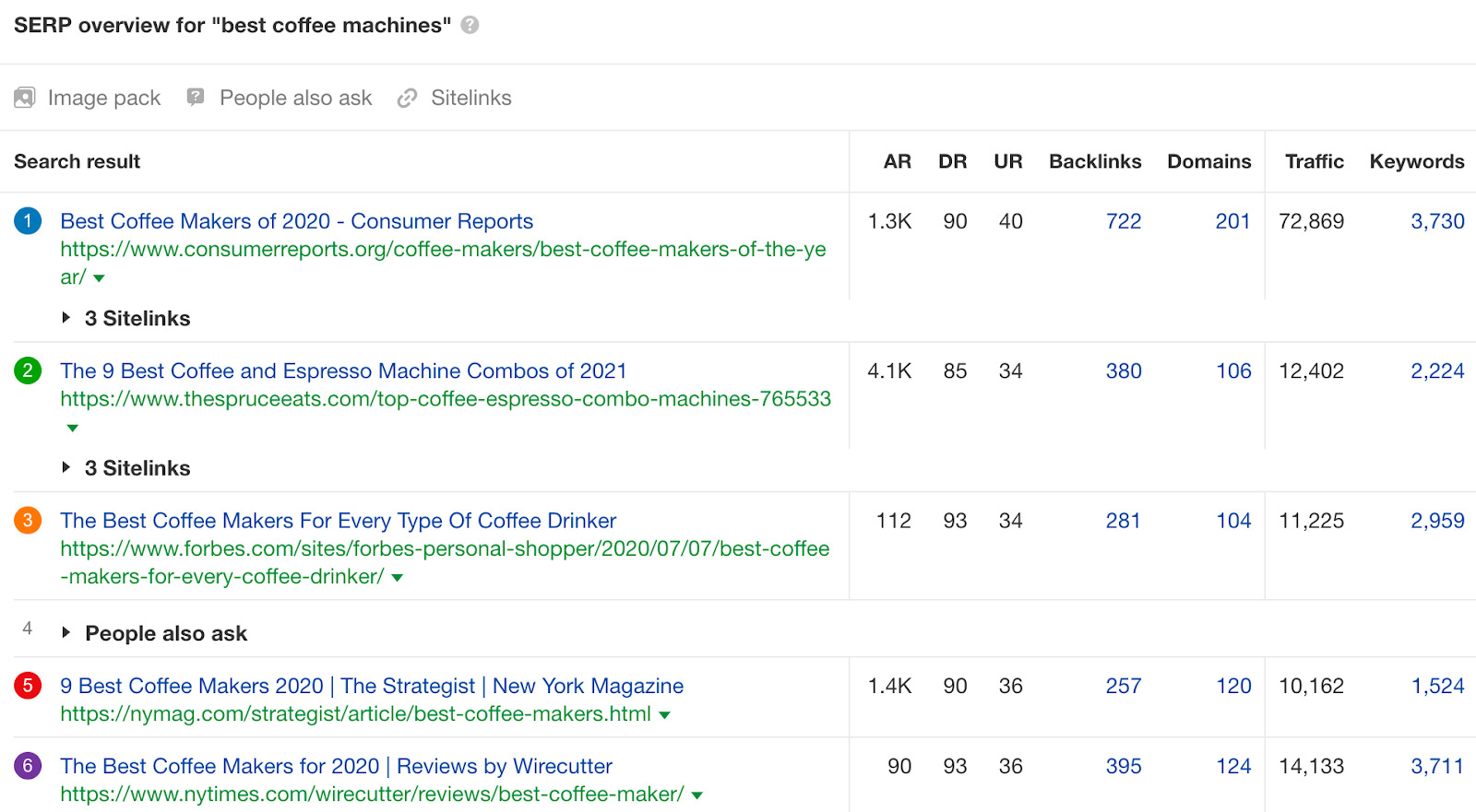 È difficile competere per certe parole chiave se sei una piccola azienda. Ad esempio, i risultati di ricerca per la parola chiave “miglior macchina da caffè” sono dominati da siti enormi.