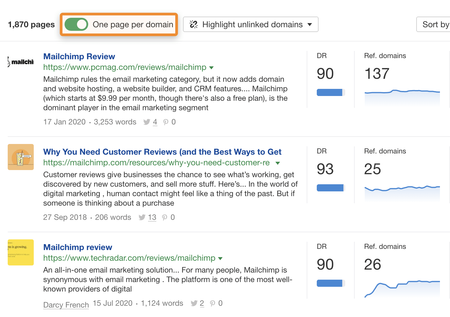 Per farlo, cerca le recensioni dei tuoi brand concorrenti all’interno del Content Explorer. Ad esempio, se vuoi lanciare un software di email marketing, uno dei tuoi concorrenti potrebbe essere MailChimp, quindi dovresti cercare qualcosa come “recensione mailchimp”.