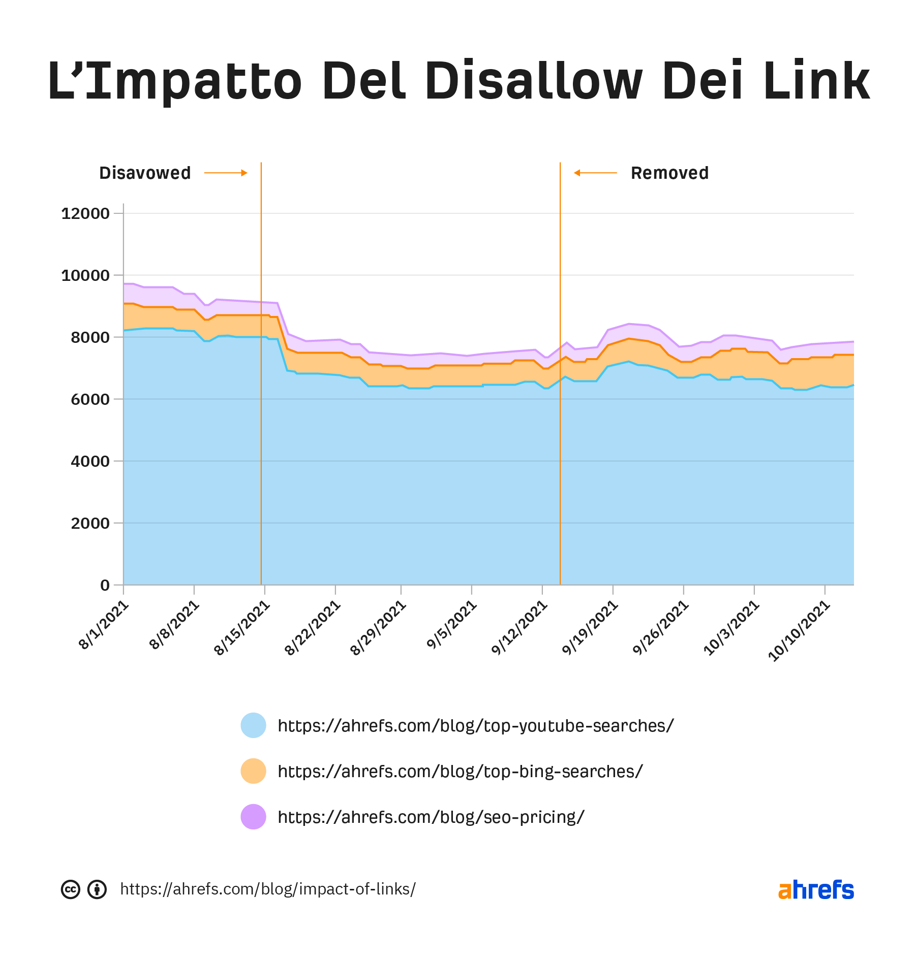 Abbiamo disconosciuto 3.476 link in 3 post del blog. Il file per il disallow è stato caricato il 17 agosto e rimosso quattro settimane dopo, il 14 settembre.