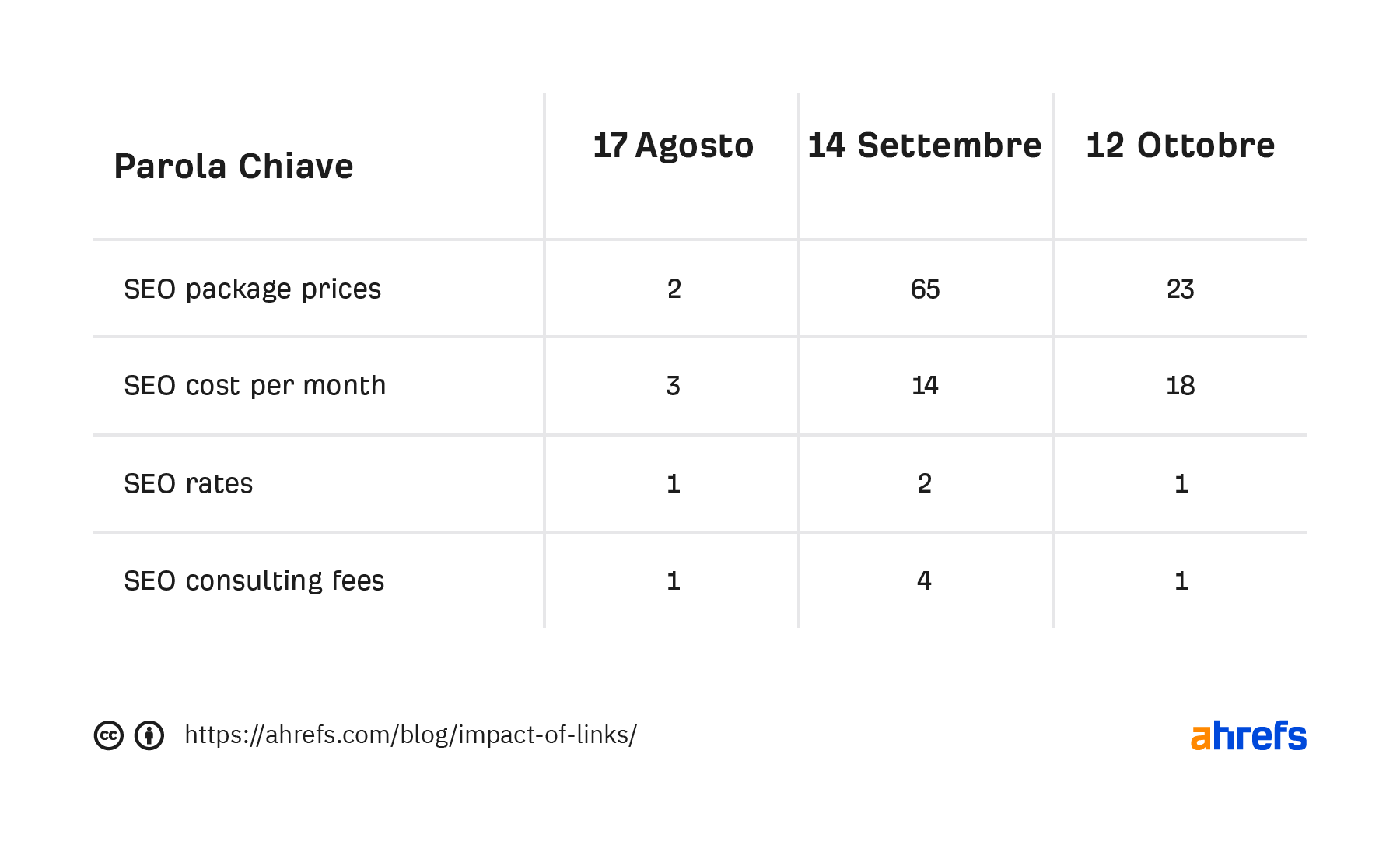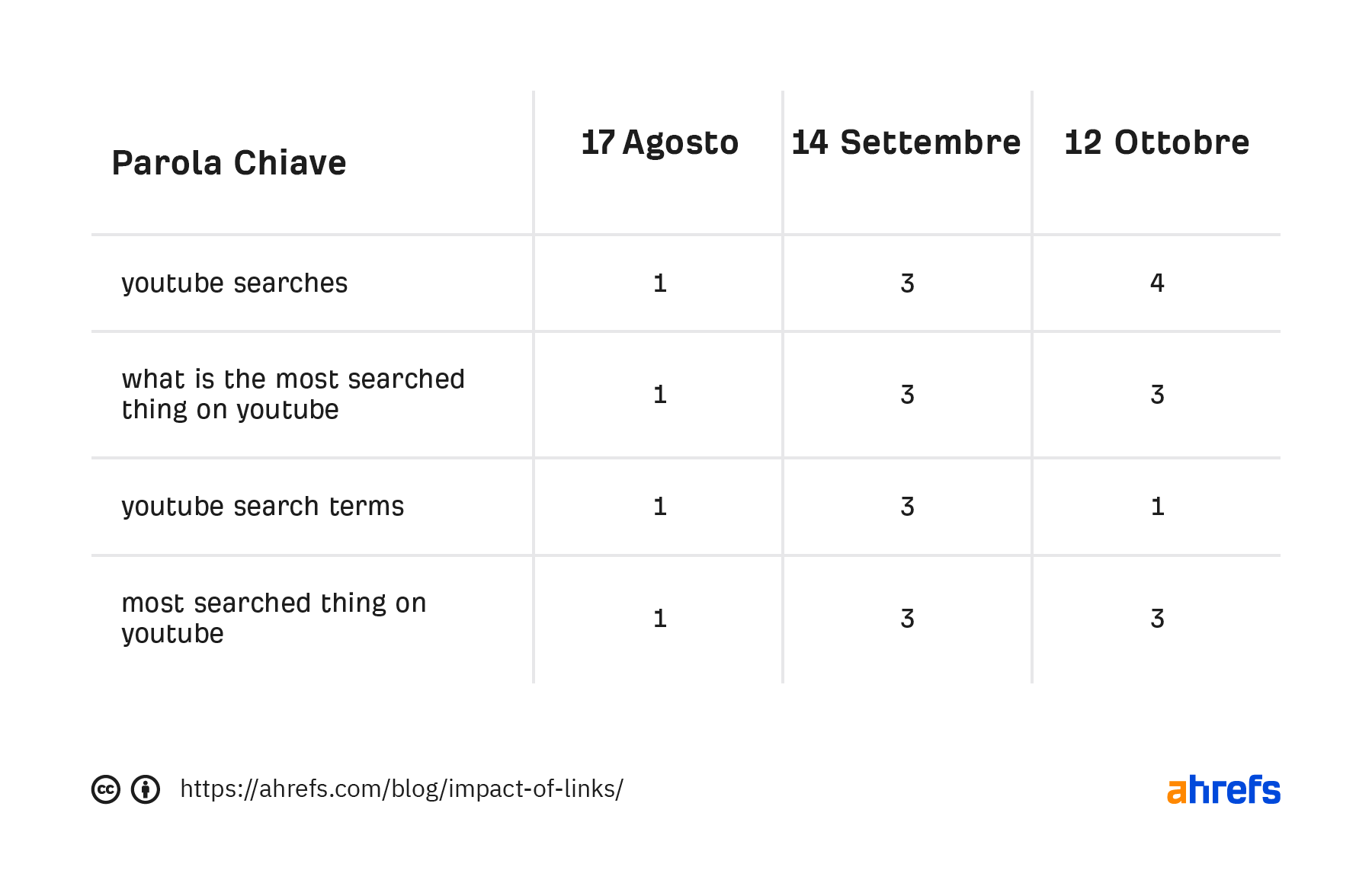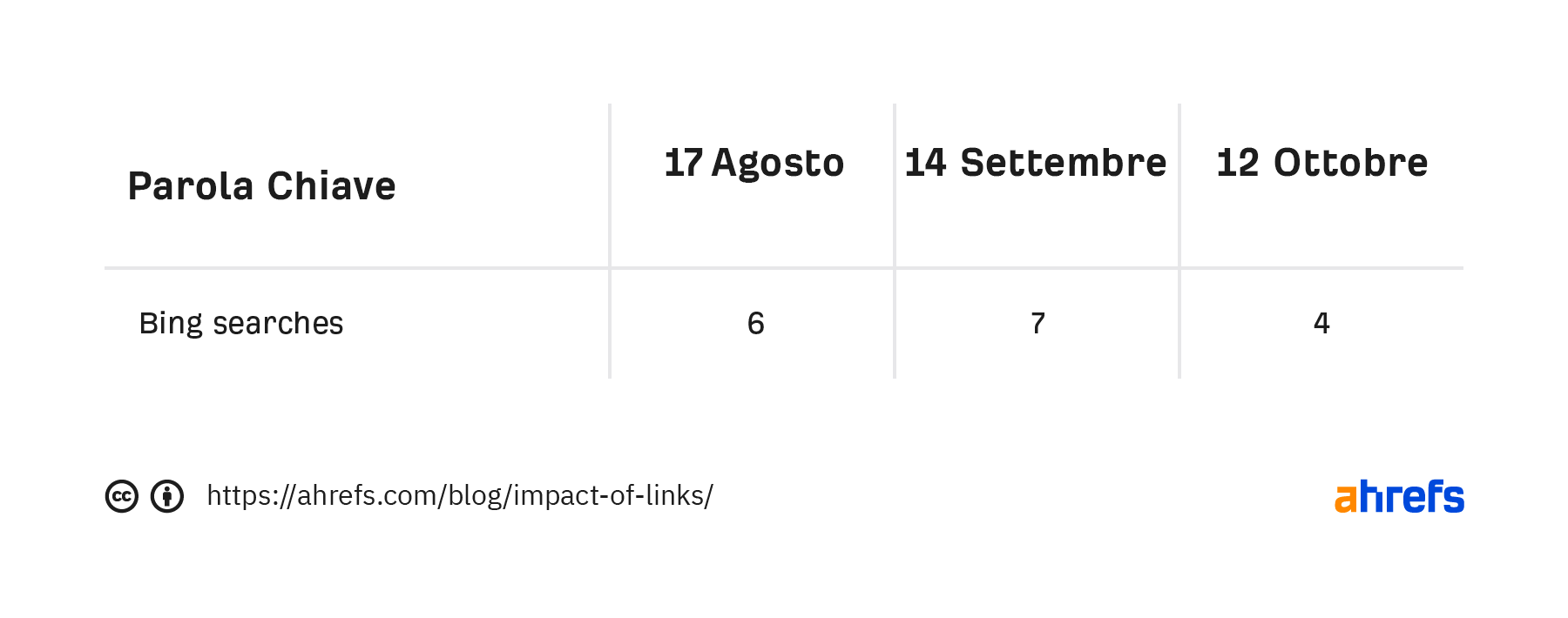 Invece di cercare nuovi link per delle pagine, ho pensato che il modo più semplice per verificare l’impatto dei link sul posizionamento sarebbe stato disconoscere i collegamenti verso una pagina e vedere cosa sarebbe successo, ovvero beneficiare della funzione di disallow dei link. Con l’aiuto di Joshua Hardwick, Responsabile dei Contenuti di Ahrefs, abbiamo selezionato tre articoli e abbiamo disattivato tutti i link a queste pagine per un mese; facendo questo, abbiamo eliminato il potenziale valore dei link esterni. Un mese dopo, li abbiamo ripristinati per beneficiare nuovamente del loro valore.