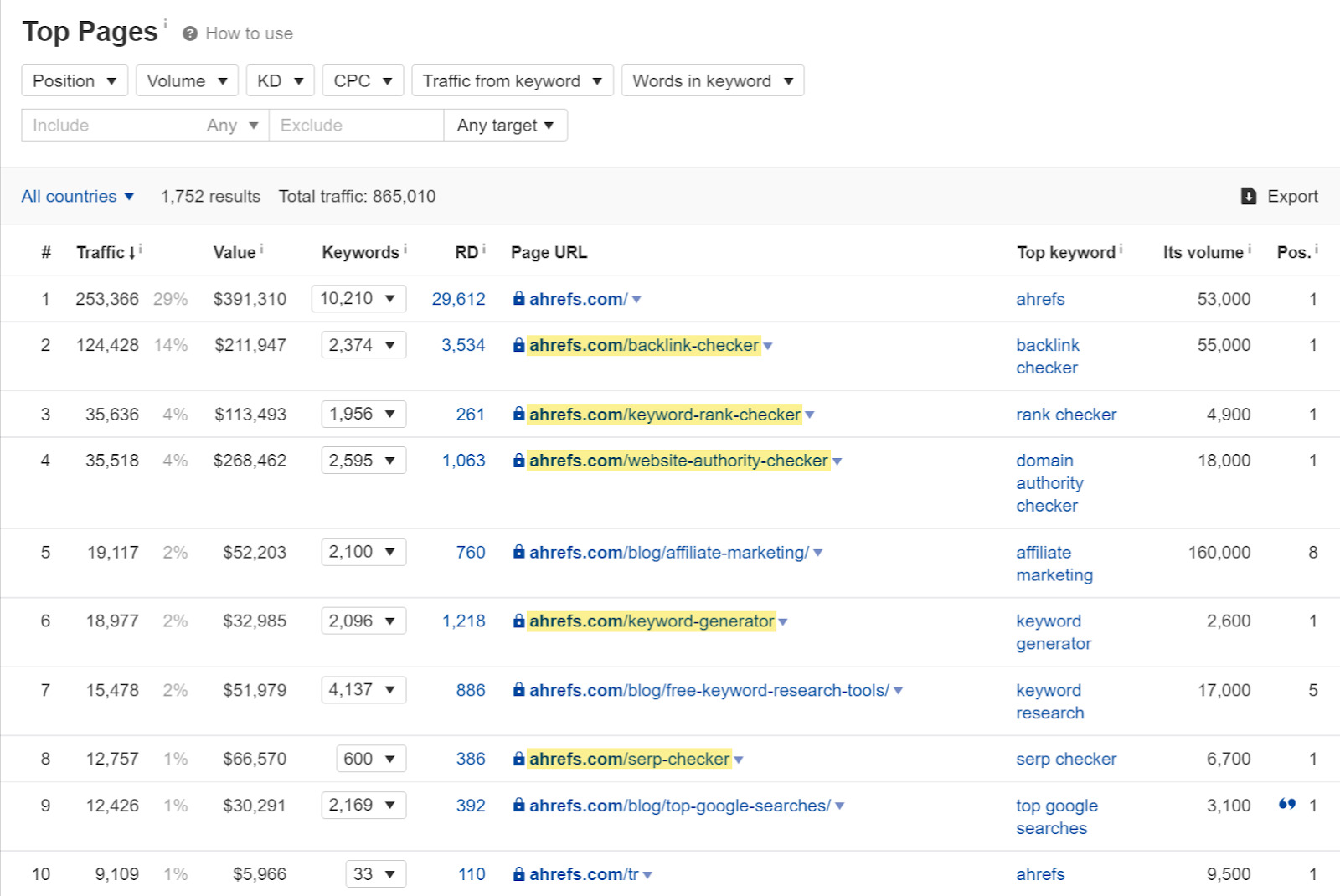 Se sei curioso di sapere quanto traffico ci portano i nostri tool gratuiti, puoi utilizzare il report Top Pages all’interno del Site Explorer inserendo il nostro dominio: