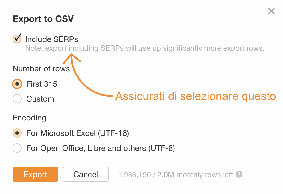 Premi il pulsante “Esporta”, controlla il riquadro “Includi le SERP”, ed esporta.