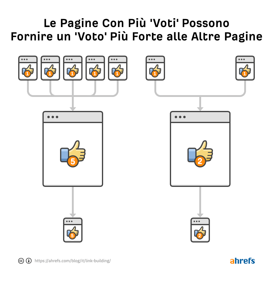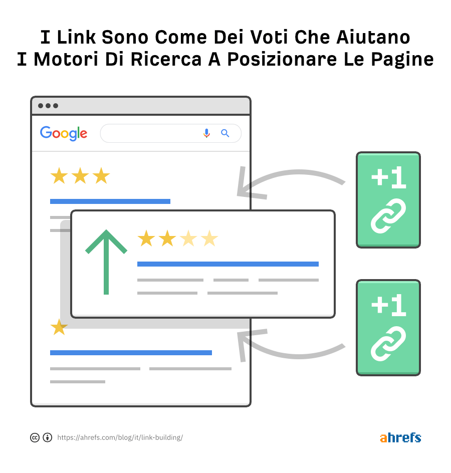 Google (e gli altri motori di ricerca), vedono i link provenienti da altri siti come una sorta di “voto”. Questi voti li aiutano a identificare quali pagine riguardo uno specifico tema (fra le migliaia di quelle esistenti) sono degne di posizionarsi in cima ai risultati di ricerca.
