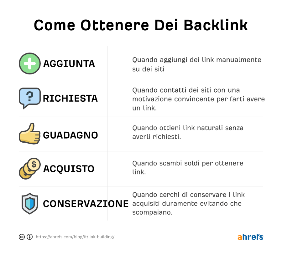 Concettualmente, la maggior parte delle tecniche e delle strategie di link building fa parte di uno dei seguenti gruppi: Aggiunta, Richiesta, Acquisto, Guadagno e Conservazione.