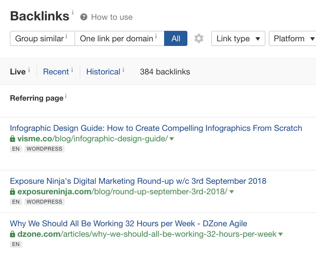 Ora tutto quello che devi fare è esaminare i blog che hai trovato e stimare le tue possibilità di avere un contenuto pubblicato lì. Se i blog sembrano troppo deboli o forti rispetto a te, aggiusta il filtro del DR finchè non trovi il giusto equilibrio.