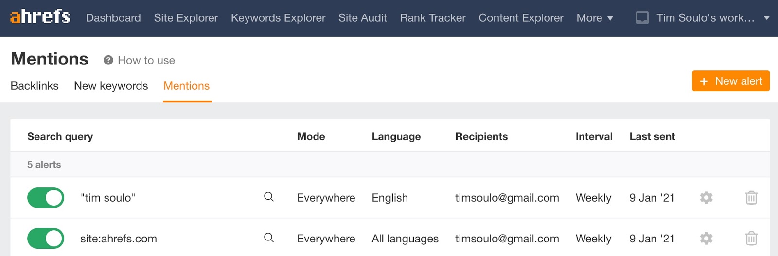 Ahrefs Alerts compie un ottimo lavoro su entrambi i fronti: backlink e menzioni di parole chiave.